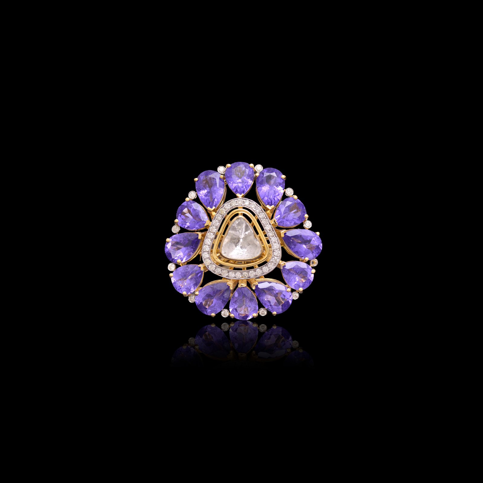 Elegant Polki ring featuring a vibrant blue stone stone, set in luxurious 14K gold. Accentuated with Diamond Polki, this ring blends traditional charm with modern sophistication
